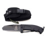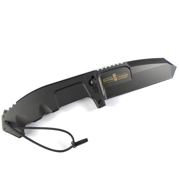 Il risultato è il RAO, un coltello da sopravvivenza, non un grosso chiudibile ma un compatto coltello da lavoro dalla lama pesante e robusta con il meccanismo di blocco in apertura particolarmente resistente, coadiuvato da un sistema di sicura che lo trasforma in un vero lama fissa. L’apertura e la chiusura sono operabili a due mani, agendo sulle estremità laterali del perino di blocco della lama, in modo da minimizzare i rischi di autolesione durante l’operazione. La lama a causa del suo peso, è infatti una vera e propria ghigliottina. Per garantire il 100% di tenuta del meccanismo di blocco, a causa degli impieghi pesanti e della violenza dei colpi determinati dalla massa dello strumento, è stato applicato un perino d’acciaio filettato che trova la sua sede nei due fori sulla guardia delle massicce guancette in alluminio anticorodal. Avvitando il perino in questa sede, si frappone fra la lama e le dita dell’utilizzatore fornendo anche un importante effetto psicologico. Il fodero è una componente essenziale del sistema perchè, oltre ad alloggiare un riaffilatore diamantato, permette di portare il coltello aperto, trattenuto da un laccio con doppia clip, o chiuso nell’apposita tasca anteriore. Il sistema di fissaggio del fodero all’utilizzatore è tipo M.O.L.L.E. che si adatta ai gillet tattici di ultima generazione ed alle cinture generiche.